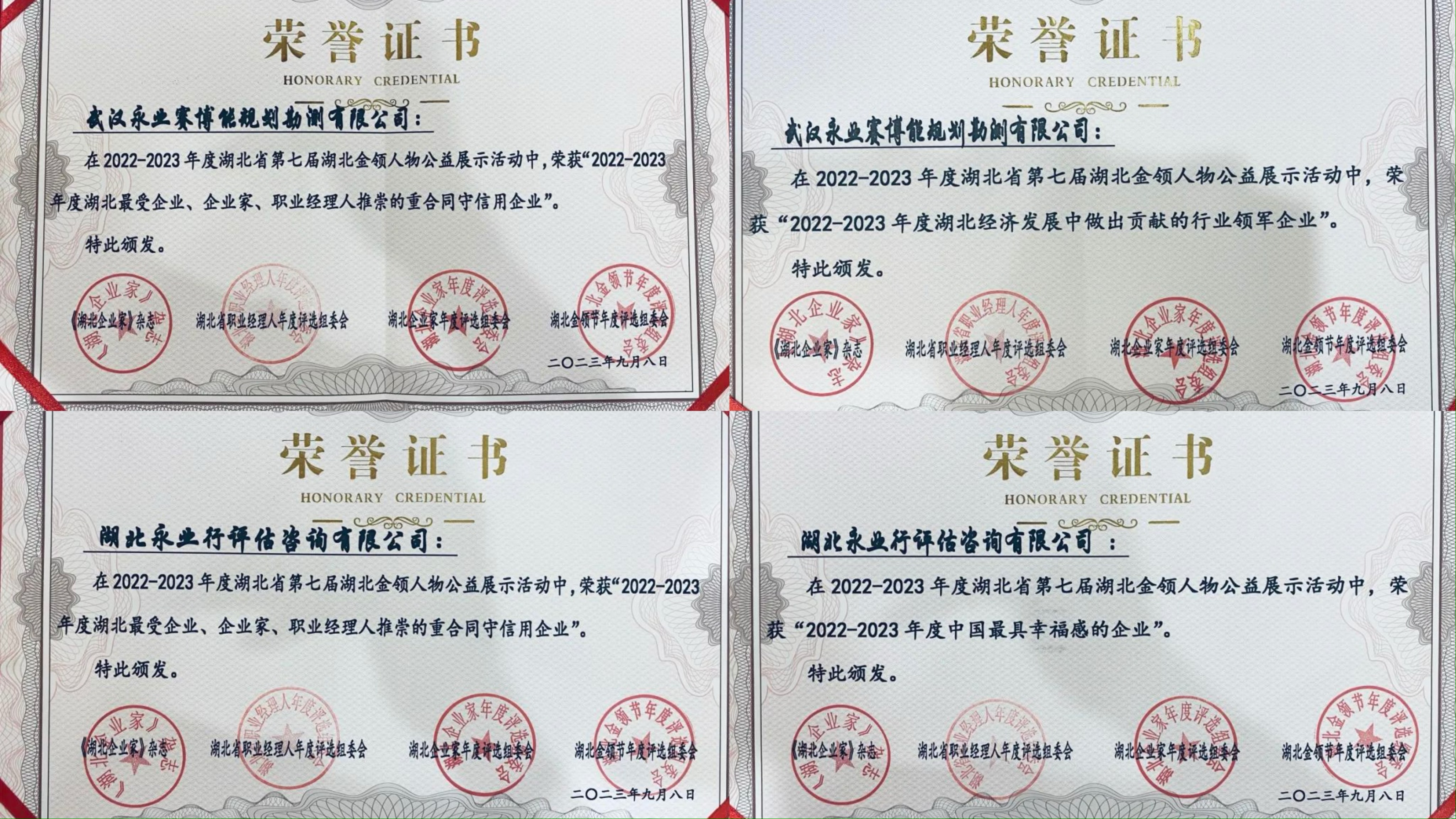 2023年9月8日,湖北省第七届金领节暨(2022-2023年度)杰出、优秀企业家、职业经理人表彰活动在武汉市蓝天宾馆举行。湖北省工商业联合会、武汉市工商业联合会、全国职业经理人协会、武汉企业联合会、武汉市中小企业协会、武汉企业信息化促进会等相关领导及获奖单位出席了本次活动。永业行获《企业社会责任管理体系评价证书》、2022-2023 年度中国最具幸福感的企业、2022-2023 年度湖北经济发展中做出贡献的行业领军企业、2022-2023 年度湖北慈善企业、2022-2023 年度湖北最受企业、企业家、职业经理人推崇的重合同守信用企业等多项荣誉。