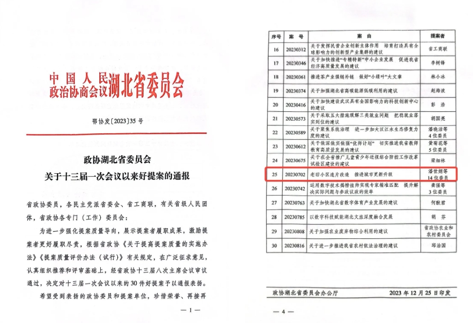 近日,省政协对十三届一次会议以来的30件好提案予以通报表彰。湖北省政协常委、永业行董事长潘世炳提出的《老旧小区连片改造 推进城市更新升级》提案,入选好提案名单。