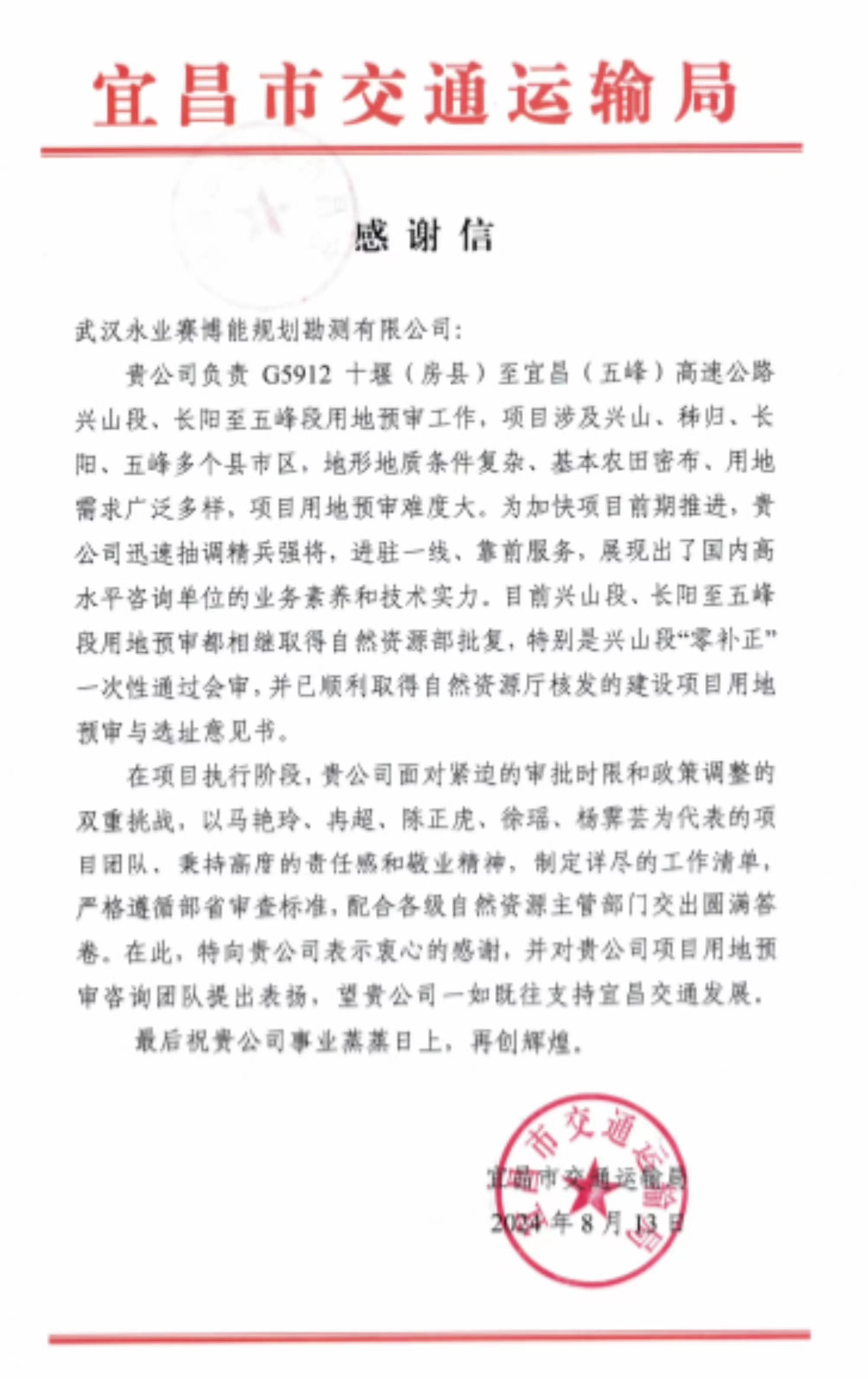 感谢信称,G5912十堰(房县)至宜昌(五峰)高速公路兴山段、长阳至五峰段,是国家公路网重点项目。自我公司承接项目用地预审工作以来,面对涉及地域广(项目涵盖宜昌市兴山县、秭归县、长阳土家族自治县、五峰土家族自治县)、用地需求多样、审批时限紧迫、过渡期土地政策复杂的多重挑战,项目组成员(马艳玲、冉超、陈正虎、杨霁芸、徐瑶等)展现了高度的专业精神和职业素养,通过对新政策、新规则的详细把控,合理分解任务,精准解决问题,克服了用地预审办理过程中的各种难题,特别是兴山段“零补正”一次性通过会审,配合各级自然资源主管部门交出满意答卷。