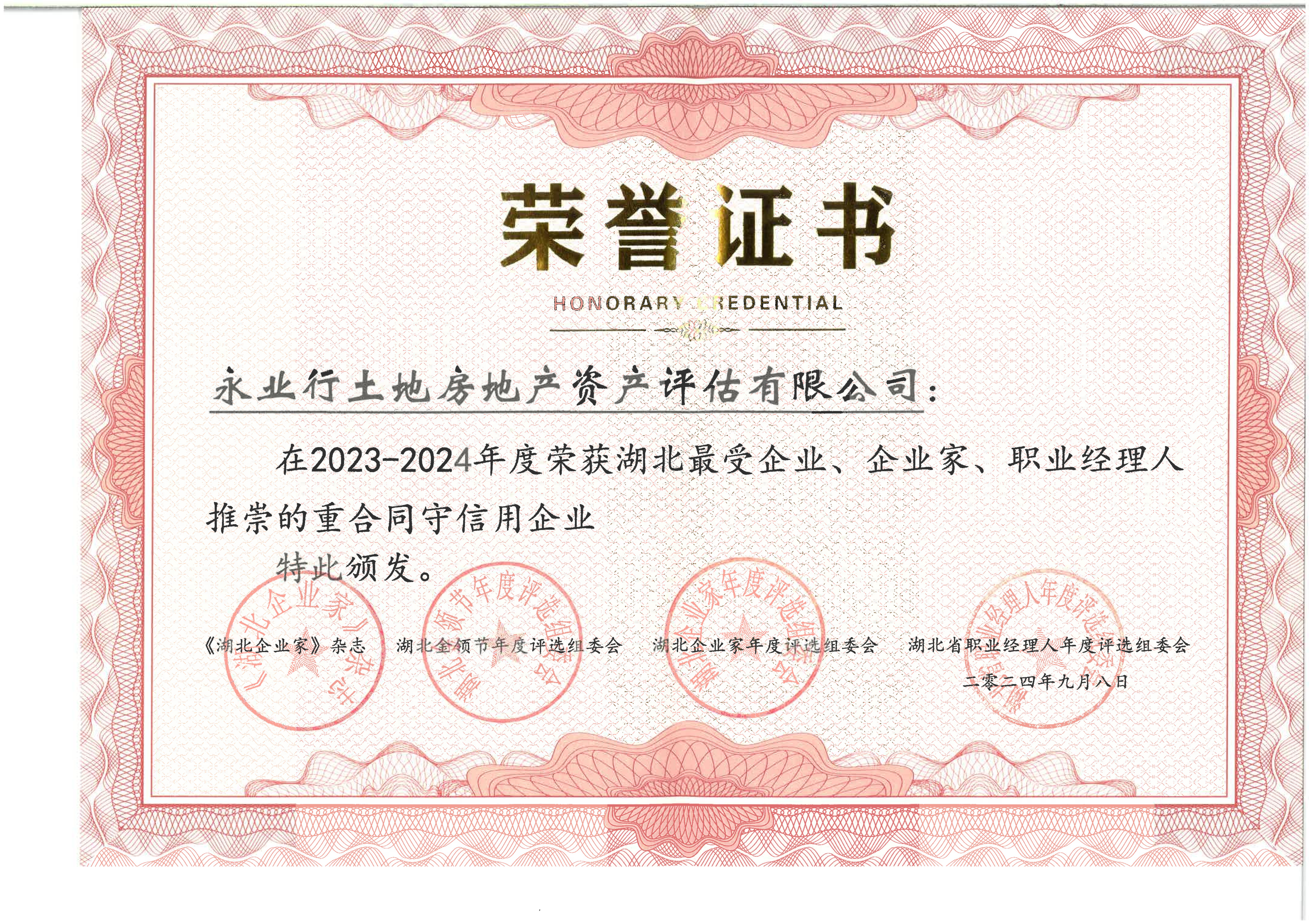 荣获2023-2024年度湖北最受企业、企业家、职业经理人推崇的重合同守信用企业