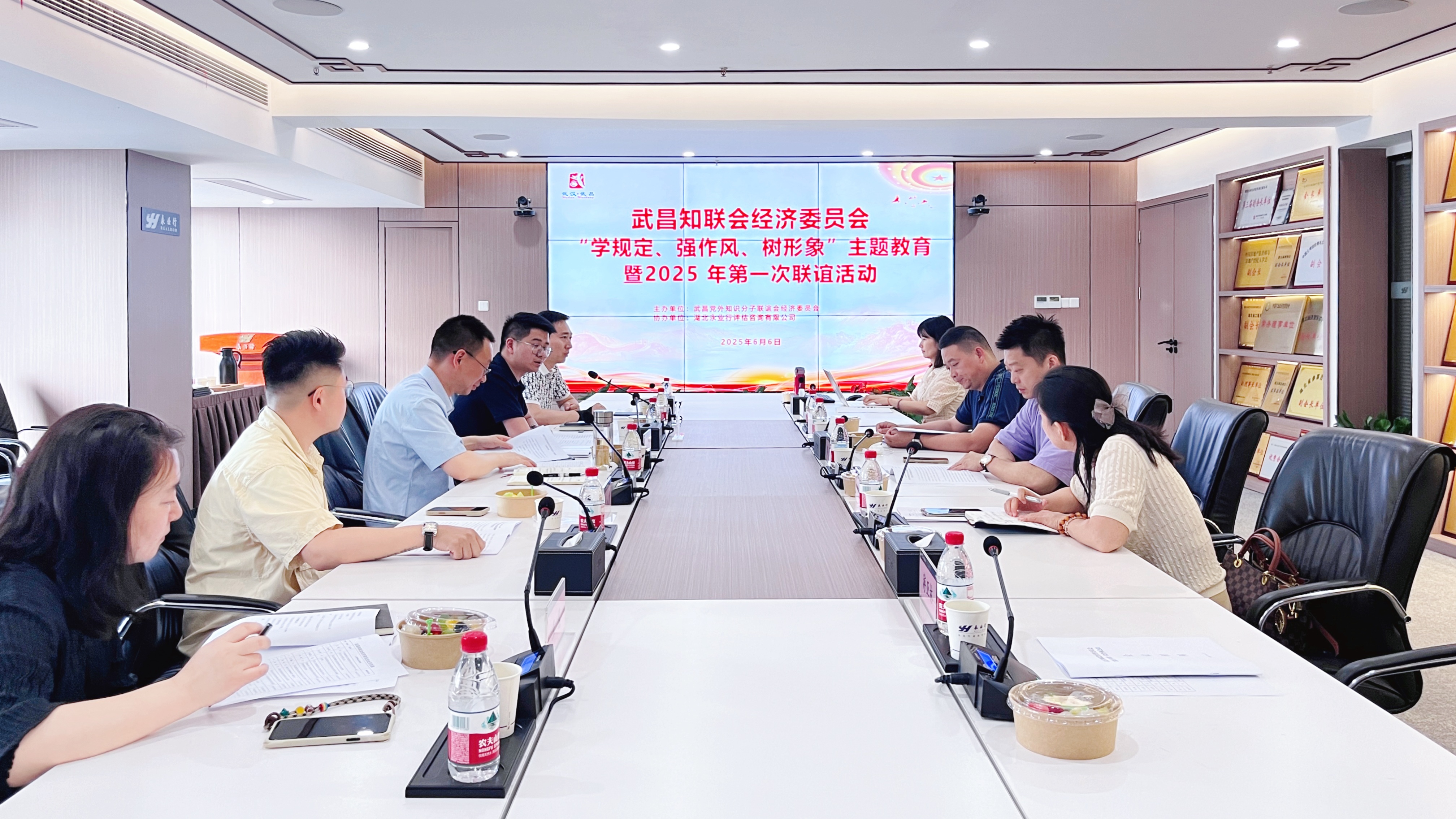 2025年6月6日,武昌知联会经济委员会“学规定、强作风、树形象”主题教育暨2025年第一次联谊活动在永业行水岸国际办公区举办。本次活动由武昌党外知识分子联谊会经济委员会(以下简称“经济委员会”)主办,湖北永业行评估咨询有限公司承办,经济委员会秘书长童庆主持会议,武昌区知联会副会长、经济委员会主任、永业行副总裁金建华出席会议。