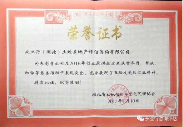2017年1月10日,永业行获评“2016年度湖北省土地评估行业慈善活动先进单位”
