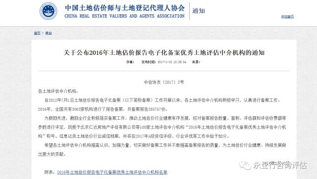 1月10日,中国土地估价师与土地登记代理人协会(以下简称“中估协”)公布了“2016年土地估价报告电子化备案优秀土地评估中介机构”名单,永业行获得此项荣誉称号,湖北省排名第一,全国第九。