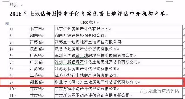 2017年1月10日,永业行获“2016年土地估价报告电子化备案优秀土地评估中介机构”称号,湖北省排名第一