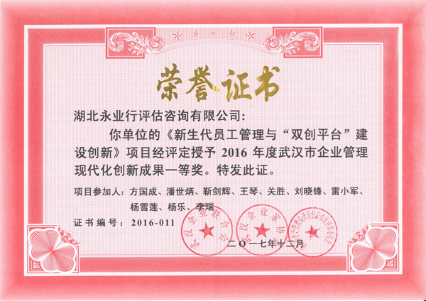 2018年1月10日,武汉企业联合会、武汉企业家协会第二届理事会第四次会议在武汉国际会展中心召开。永业行申报的企业管理现代化创新成果《新生代员工管理与“双创平台”建设创新》获评一等奖,综合部总经理杨雪莲代表永业行参会并上台领奖。