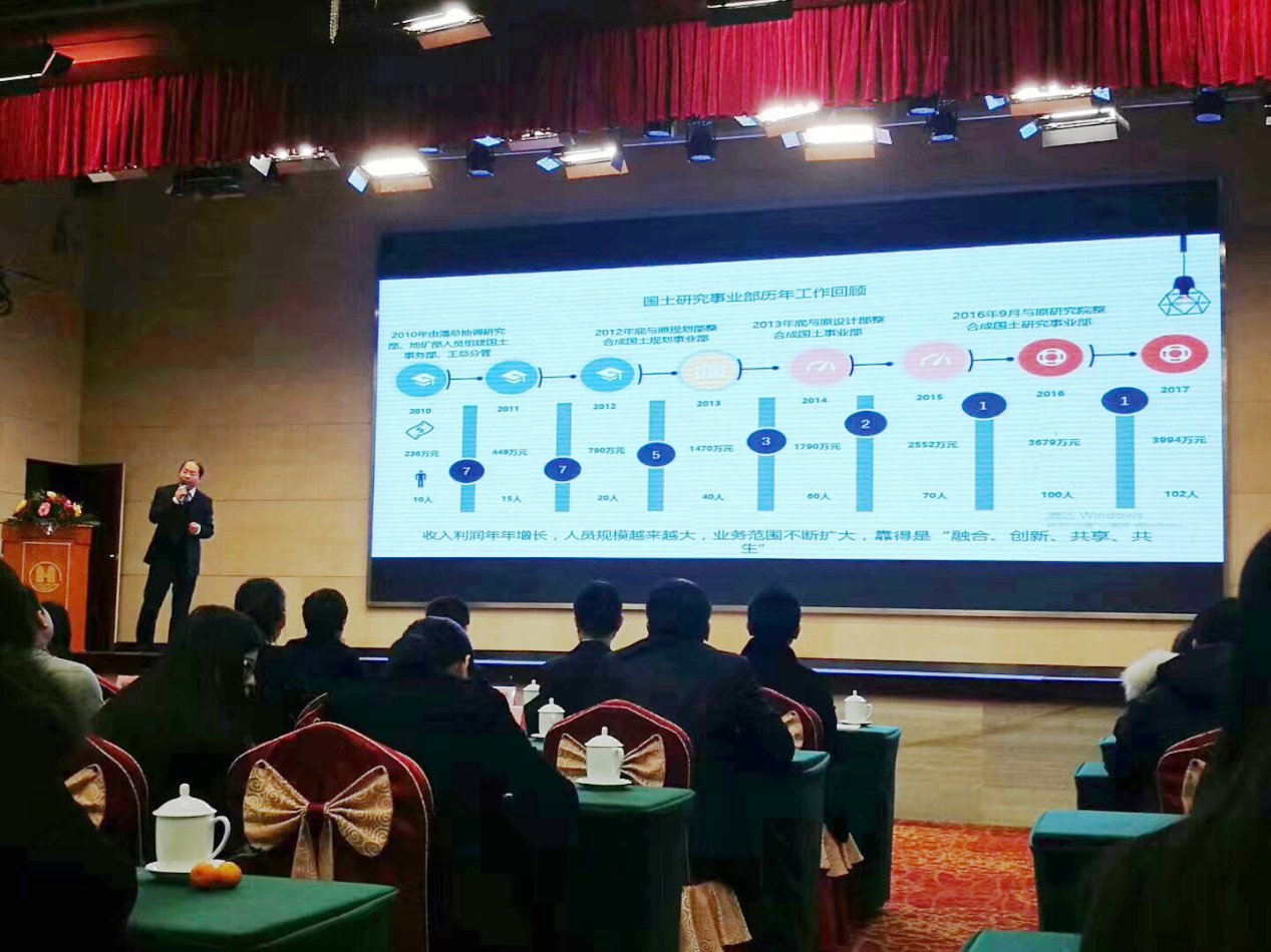 国土业务副总监兼国土研究事业部负责人吴学锋在会上对部门历年工作进行了简要回顾,生动描述了事业部一路走来不断变革发展的过程,并以“融合、创新、共享、共生”为理念诠释了对事业部未来发展的期许。事业部市场总监金建华、技术总监刘亚玲以及各市场与技术小组负责人分别对部门的市场展望、技术变革与人员管理等进行深度剖析。