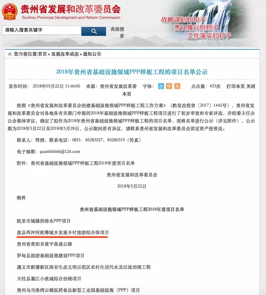近日,贵州省发展和改革委员会公布了2018年贵州省基础设施领域PPP样板工程项目名单,永业行贵州分公司提供全过程咨询服务的项目——盘县西冲河统筹城乡发展乡村旅游综合体项目成功入选,本项目将获得奖补资金500万元。