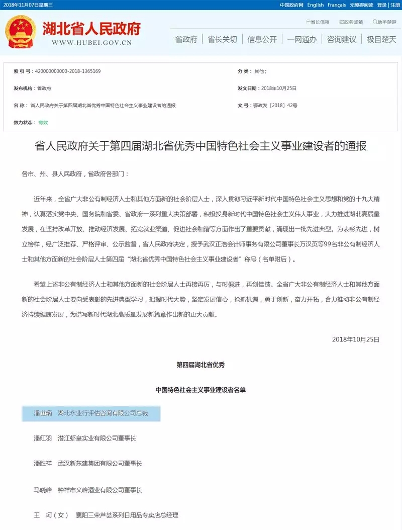 近日,湖北省人民政府发布《关于第四届湖北省优秀中国特色社会主义事业建设者的通报》 (鄂政发〔2018〕42号),永业行董事长兼总裁潘世炳被授予“湖北省优秀中国特色社会主义事业建设者”称号。
