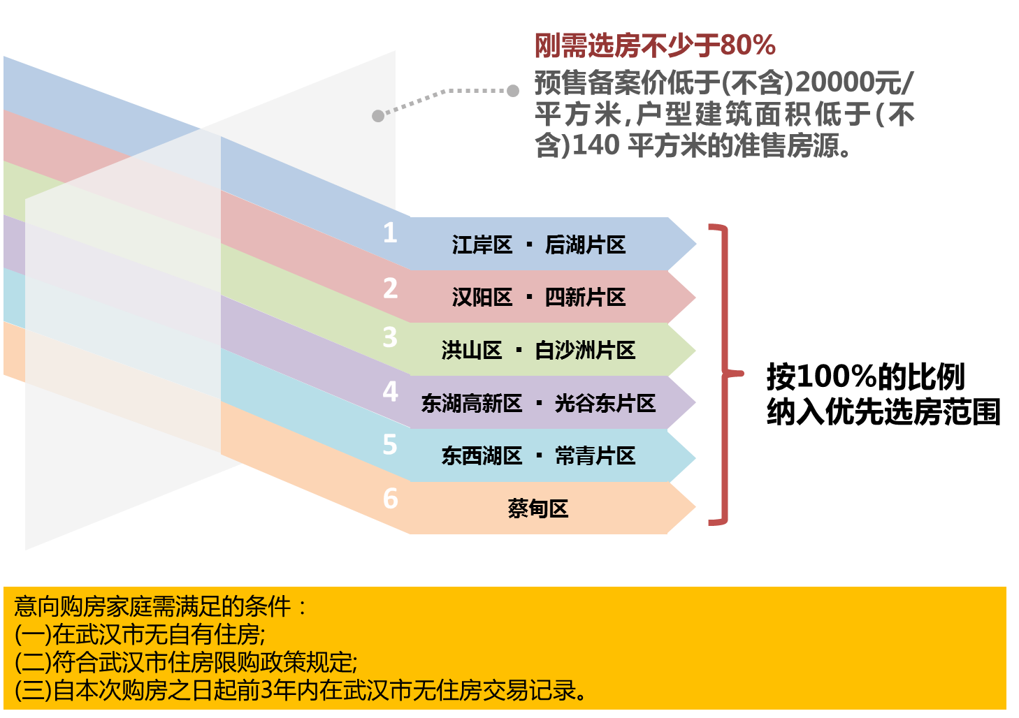 为进一步加强房地产市场分类调控工作,坚持“房住不炒”的定位,武汉市房管局针对刚需无房家庭首次购买新建商品住房操作规程进行了修订,并正式发布了相应细则。从2018年11月15日起,武汉市备案均价20000元/平方米以内、面积140平方米以下新建商品住宅项目,刚需家庭优先选房房源比例将不低于80%,洪山区白沙洲片、汉阳四新、东湖高新的关谷东等重点区域比例则将提高至100%。