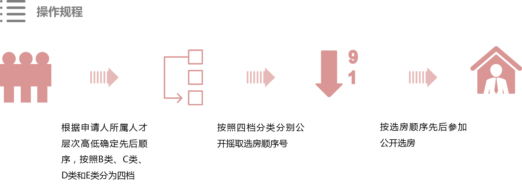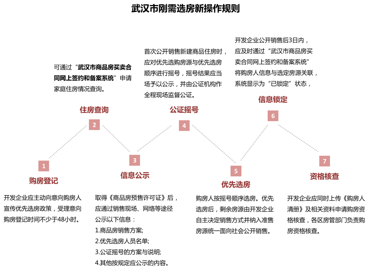 从操作程序上来看,具体工作主要涉及购房登记、住房查询、信息公示、公证摇号、优先选房、信息锁定、资格核查七个环节。