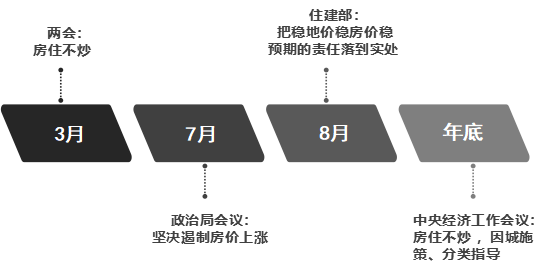 2018年是政策调控频出的一年,中央坚持“房住不炒,因城施策”的政策主基调,全国各地城市政府从“限购、限贷、限售、限价”四限来落实稳房价、控租金,降杠杆、防风险,调结构、稳预期的目标任务。2018年3月,两会再度重申“房住不炒”;7月,政治局会议从“遏制房价过快上涨”升级为“坚决遏制房价上涨”;8月,住建部提出把稳地价稳房价稳预期的责任落到实处;年底的中央经济工作会议提出,要构建房地产市场健康发展长效机制,坚持“房住不炒”的定位,因城施策、分类指导,夯实城市政府主体责任,完善住房市场体系和住房保障体系。