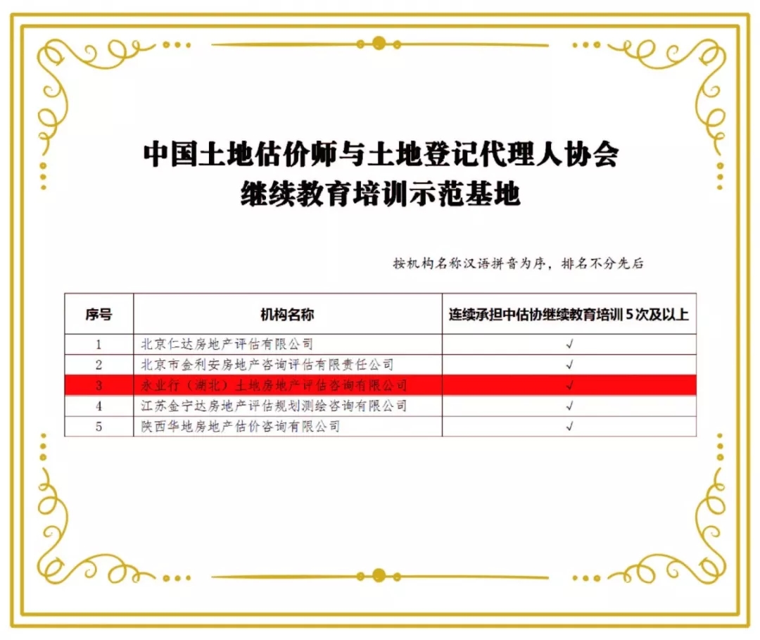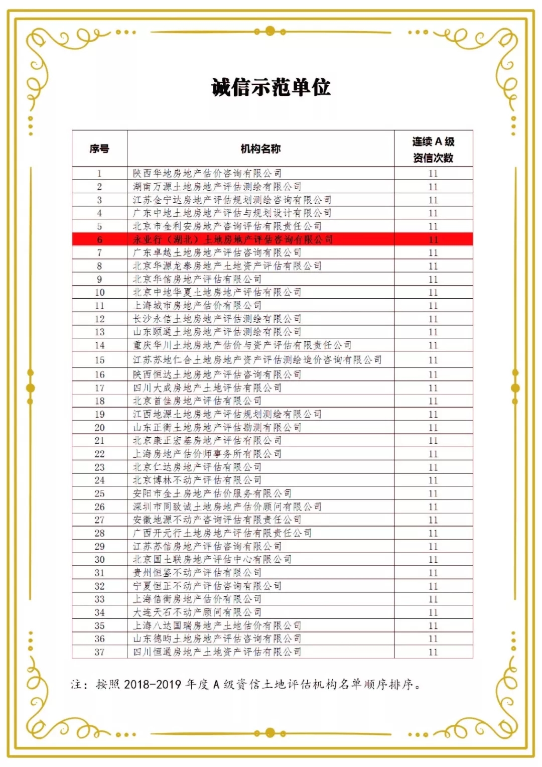 永业行长期致力于行业诚信体系创建,连续13次入选“诚信房地产估价示范机构”,自2013年以来,积极履行土地估价报告电子化备案,切实做好备案工作并不断提高备案报告的质量,5次获评“中估协全国备案优秀机构”。积极开展机构内部培训,连续6次举办中估协土地估价师继续教育班。