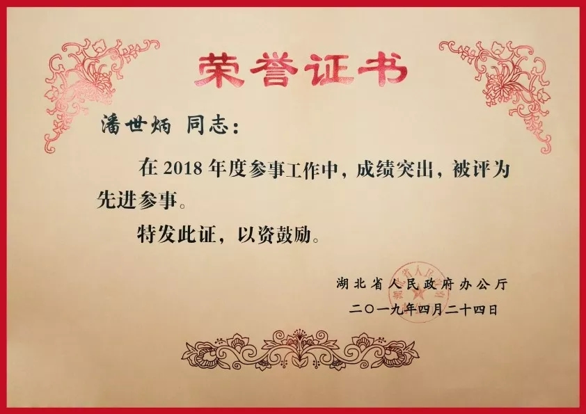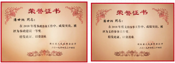 永业行董事长兼总裁、省政府参事潘世炳获得先进参事奖、参政建议一等奖和支持参事工作奖等三个奖项。办公厅要求获奖人员保持荣誉,发扬成绩,奋力谱写新时代湖北高质量发展新篇章。