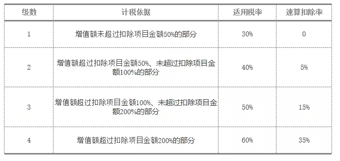 3、土地增值税:是对转让国有土地使用权、地上的建筑物及其附着物并取得收入的单位和个人征收的一种税。土地增值税按照纳税人转让房地产所取得的增值额和规定的适用税率计算征收,纳税人转让房地产所取得的收入减除《条例》规定的扣除项目金额后的余额,为增值额。它采用四级超率累进税率,应纳土地增值税=土地增值额×适用税率-速算扣除额×速算扣除率。其中:土地增值额=转让房地产总收入-扣除项目金额。计算扣除项目有:取得土地使用权所支付的金额;开发土地和新建房及配套设施的成本;开发土地和新建房及配套设施的费用;旧房及建筑物的评估价格;与转让房地产有关的税金;加计扣除。在实际测算过程中,为保持和企业实际情况一致,最好采用先预缴后清缴的口径计算折现值。