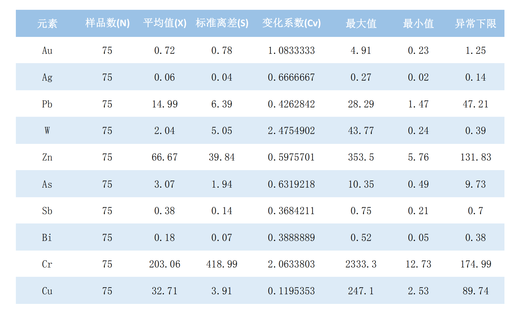 (1)中等起伏型(0.3﹤CV﹤0.6):有Pb、Zn、Bi、Cu,在区域分布中含量起伏略大,数据仍以正态或近似正态分布,局部有一定的后期改造作用。