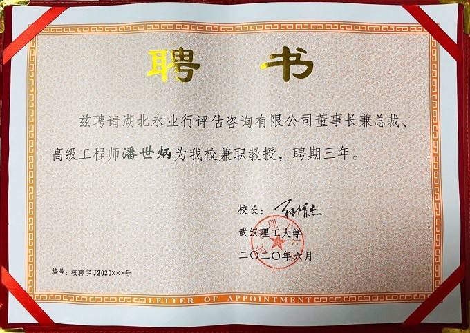 近日,永业行董事长、总裁、教授级高工潘世炳受聘为武汉理工大学兼职教授。