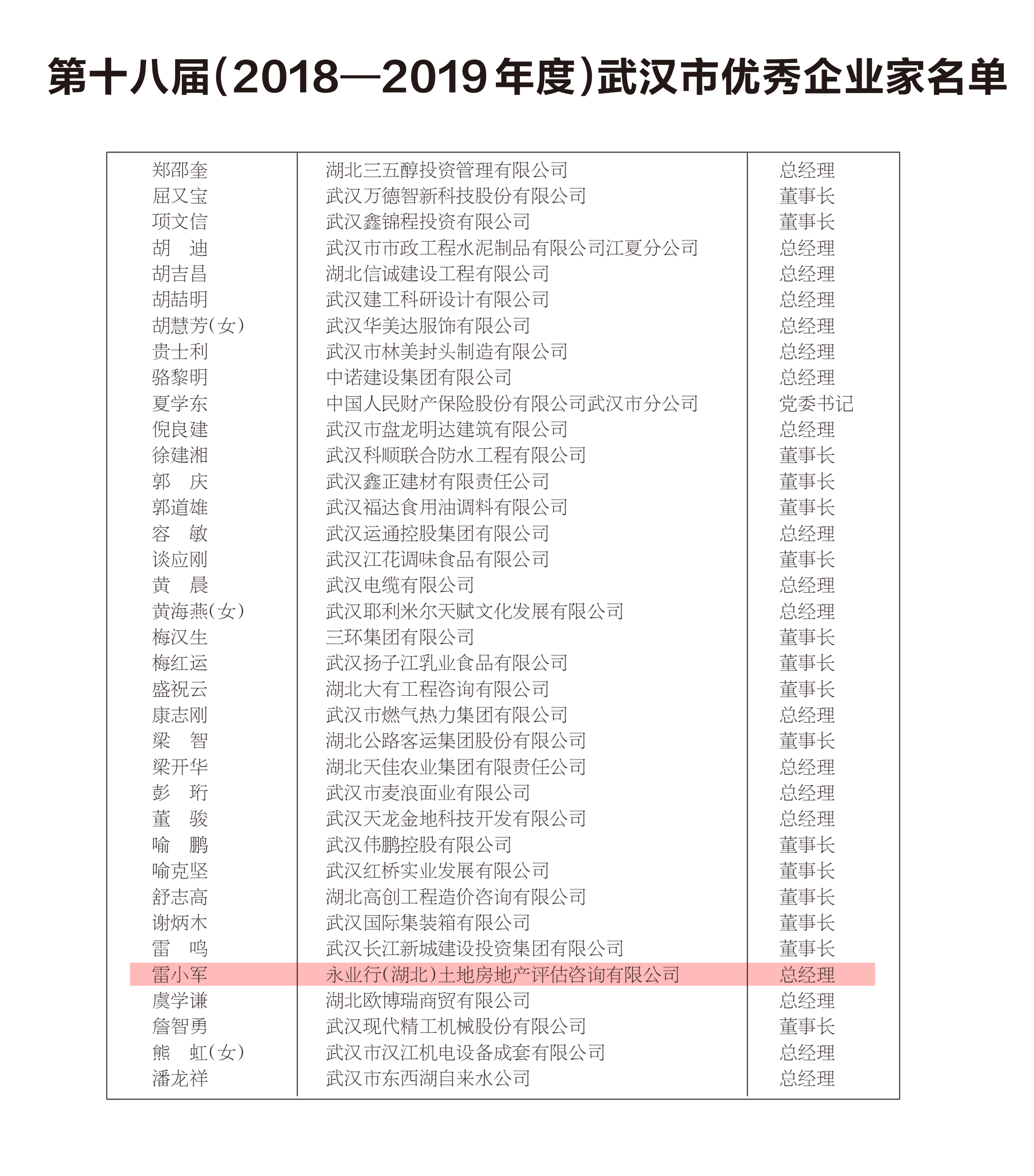 永业行上榜“武汉市优秀企业”“优秀企业家”表彰名单