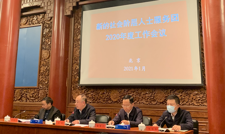 会议由六局副局长梁智卫主持,9名团员分别介绍了各个服务分团2020年的服务工作和2021工作计划。六局一级巡视员许睢宁公布了服务团2020年25位优秀团员名单。六局二级巡视员张华伟等领导及来自全国各地的新的社会阶层人士服务团成员200多人线上线下参加会议。