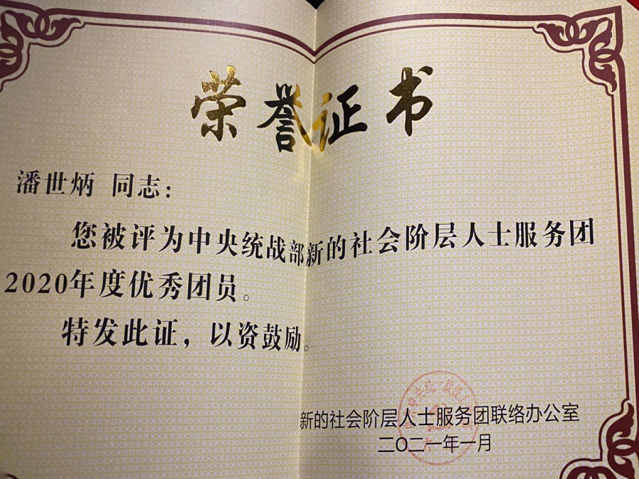 潘世炳荣获中央统战部新阶层服务团2020年优秀团员称号