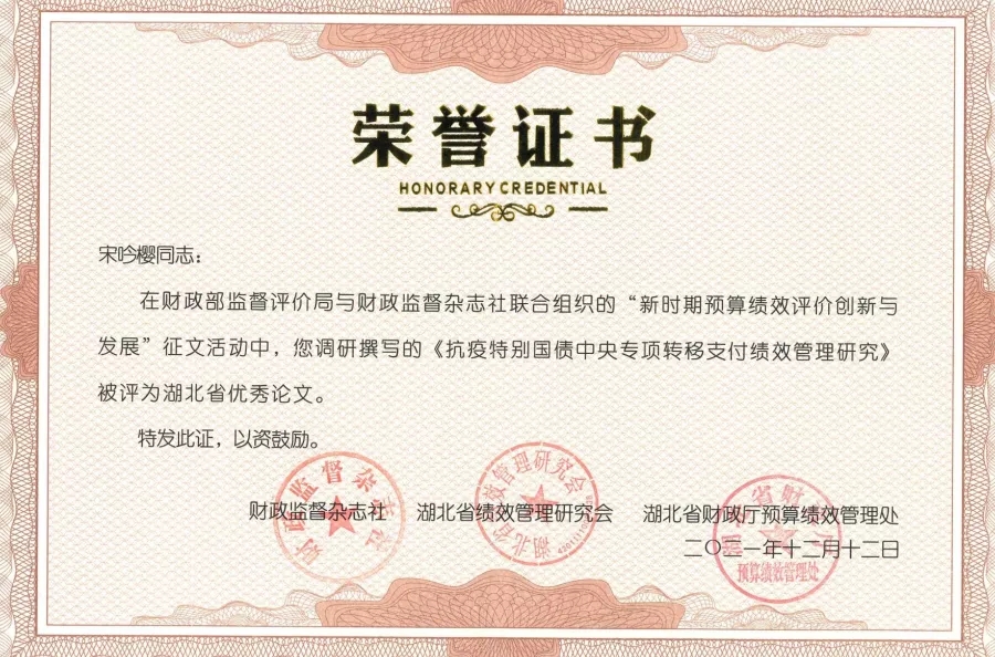 2021年12月12日,“设立‘湖北绩效日’倡议活动”在武汉举办,国内学术及研究领域专家学者、各级财政及行政部门人员、第三方机构实践专家参会。会上,对“新时期预算绩效评价创新与发展”征文活动进行了颁奖,永业行财税咨询技术副总监宋吟樱调研撰写的《抗疫特别国债中央专项转移支付绩效管理研究》获评湖北省优秀论文。