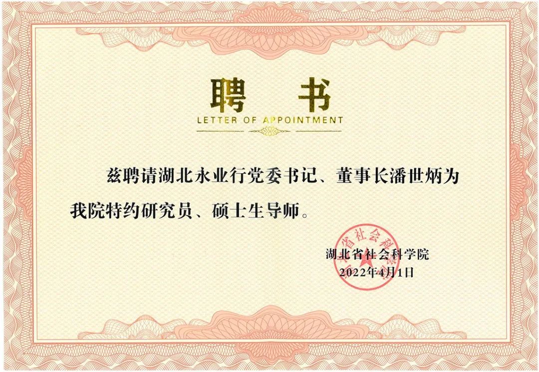 2022年4月1日,湖北省社会科学院举行聘任仪式,永业行党委书记、董事长潘世炳博士受聘为湖北省社会科学院特约研究员、硕士生导师。湖北省社会科学院党组书记张忠家向潘世炳博士颁发聘书,党组副书记、院长刘光远主持聘任仪式。