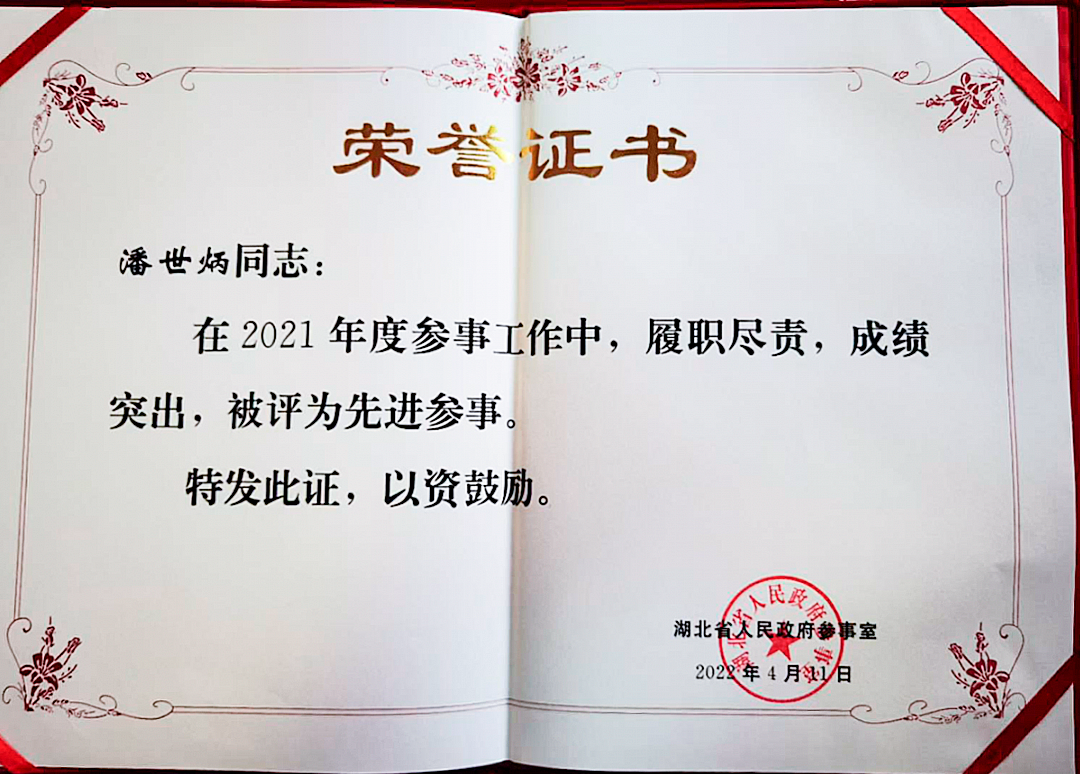 近日,湖北省人民政府参事室发文,对2021年度先进参事和参事工作单项奖获奖参事进行通报表彰,省政府参事、永业行董事长潘世炳荣获先进参事、参政建议一等奖。
