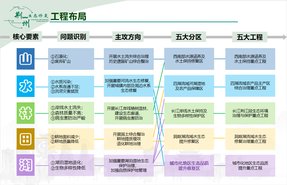 《规划》形成五大生态修复分区:长江岸线水土保持及生物多样性修复区、四湖流域河湖湿地及农产品保障区、洞庭湖流域水生态提升修复区、西南部水源涵养及水土保持修复区、城市化地区生态品质提升修复区。