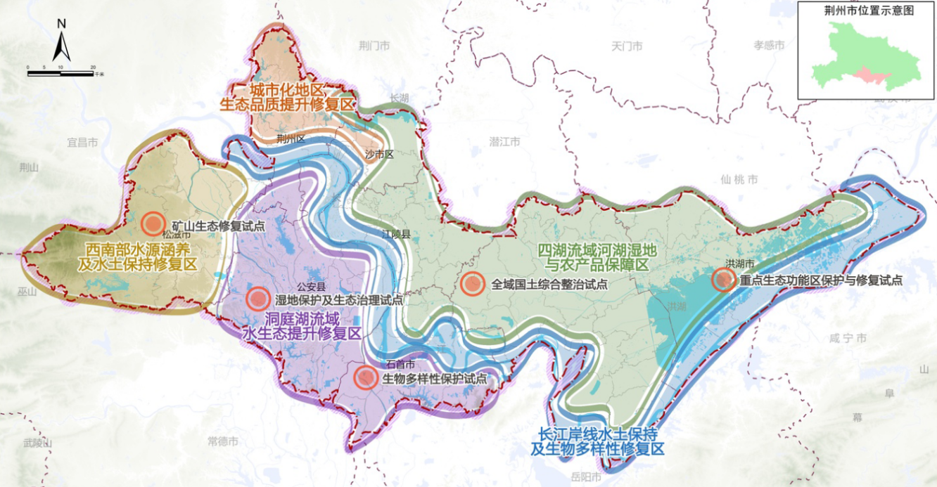 《规划》以“山”、“水”、“林”、“田”、“湖”为有机整体,构建人与自然和谐发展的生态修复安全格局,从根本上解决荆州地区生态系统服务功能退化的趋势,使荆州生态环境质量得到总体改善,生态系统服务功能稳定提高,生态系统稳步健康发展。