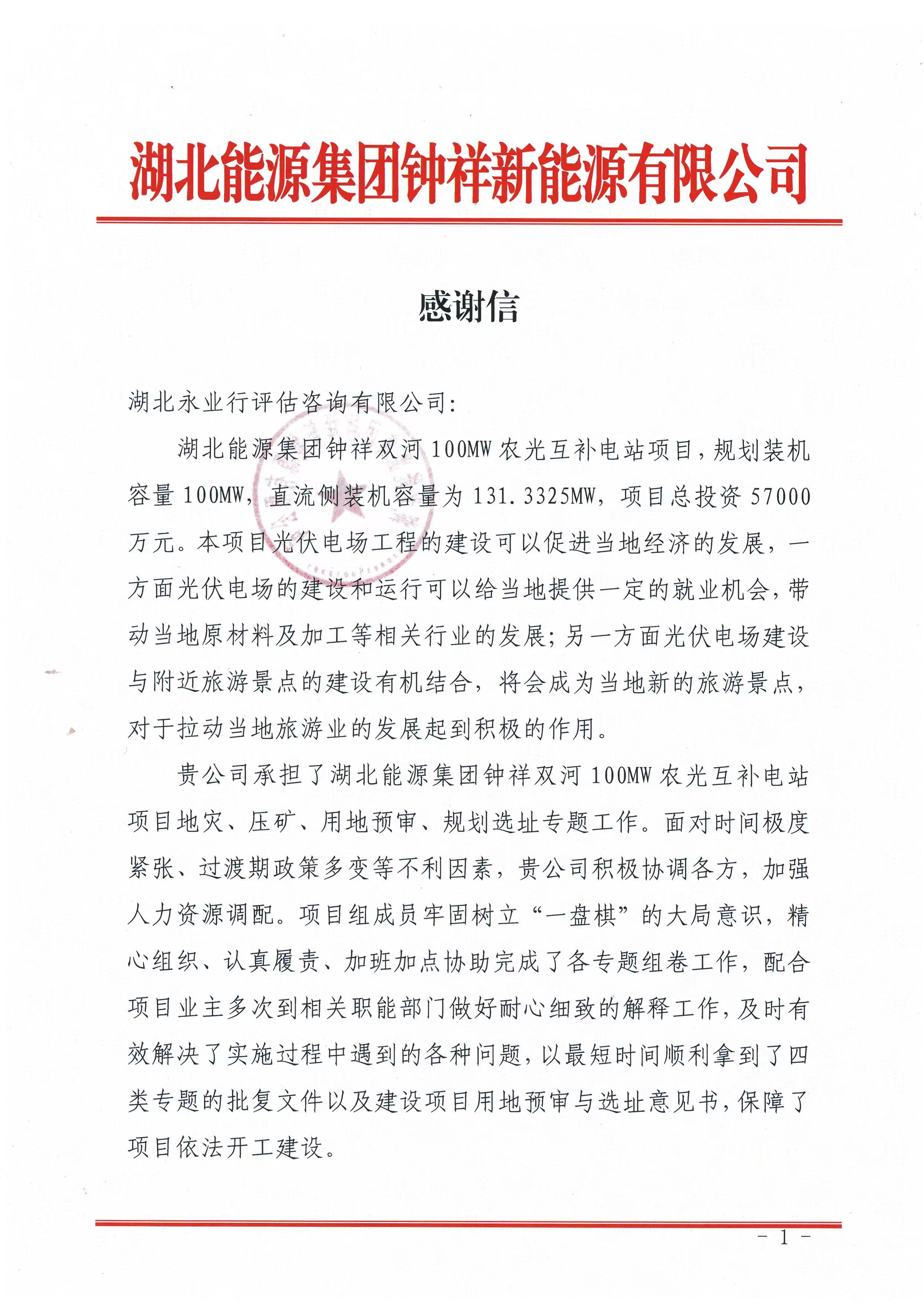 2022年8月16日,湖北能源集团钟祥新能源有限公司致函永业行,对我司承担的钟祥双河100MW农光互补电站项目地灾、压矿、用地预审、规划选址专题工作给予肯定和感谢。
