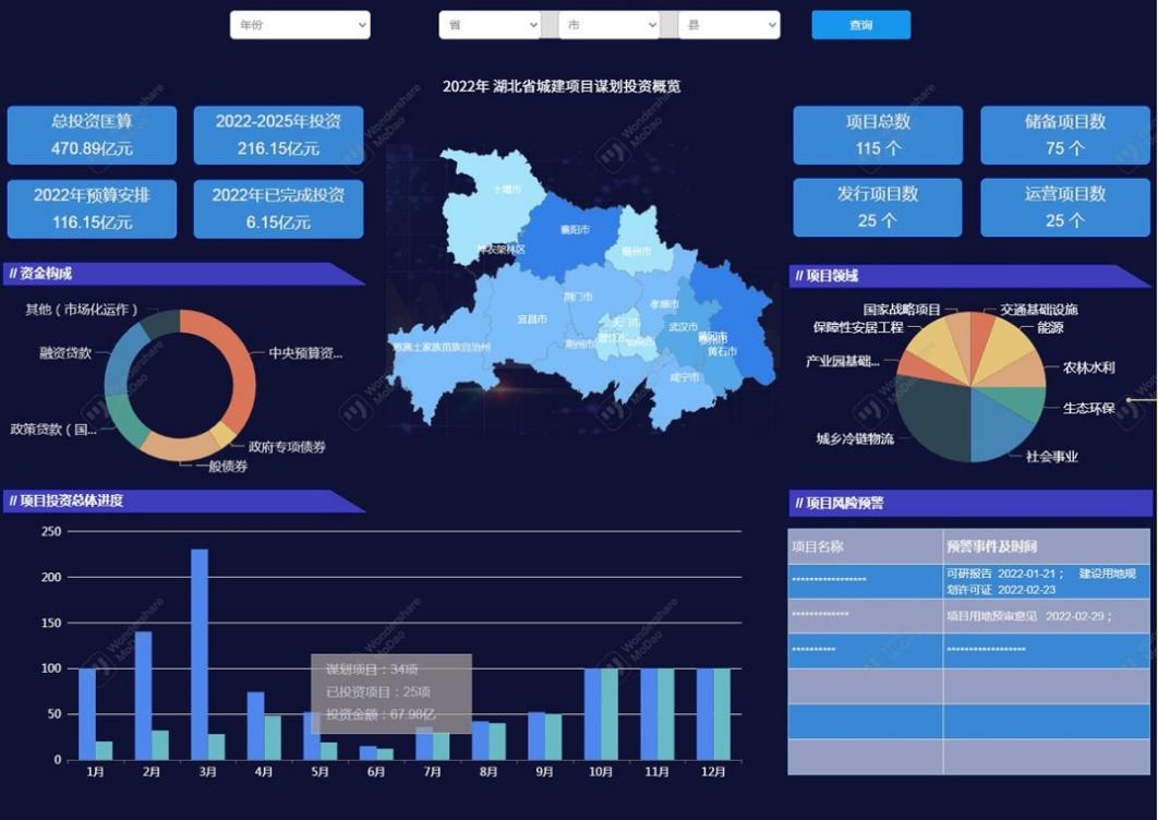 二是具备项目全过程一体化咨询服务能力。按照统筹到具体、从传统咨询到信息化交付的原则,提供从项目谋划到专项债项目全过程管理到项目全生命周期一体化交付全流程服务。在项目谋划阶段,系统性、前瞻性考虑项目投融建管运全生命周期,为湖北省多地政府、企业开展项目谋划系列专题培训,助力地方政府谋划和策划生成符合国家投向、符合融资要求、符合行业标准、符合地方实际的高质量建设项目;在项目全过程管理阶段,根据重点关注和支持的领域谋划策划项目,把握申报和审核要点,精准开展项目资金申报。在落实专项债项目立项、土地报批、资金申报等环节的基础上,强化项目后期运营管理,提供资金使用与监管、绩效考核等全过程咨询服务;在信息化交付阶段,自主研发城建项目管理平台,通过大屏展示、项目动态管理、项目地图等信息化功能,为地方政府提供全流程信息保障。