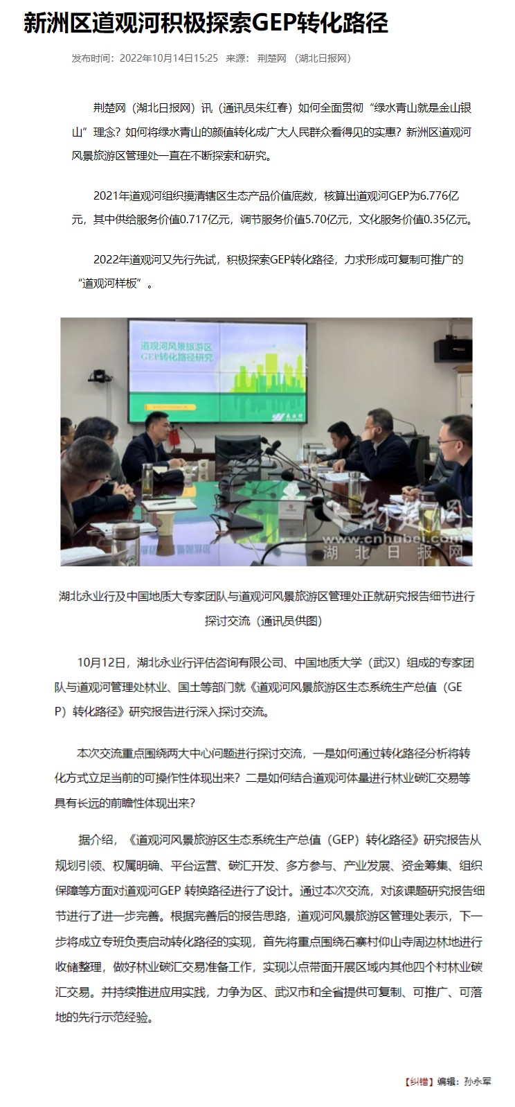 永业行荆楚网报道我公司道观河风景旅游区GEP转化项目