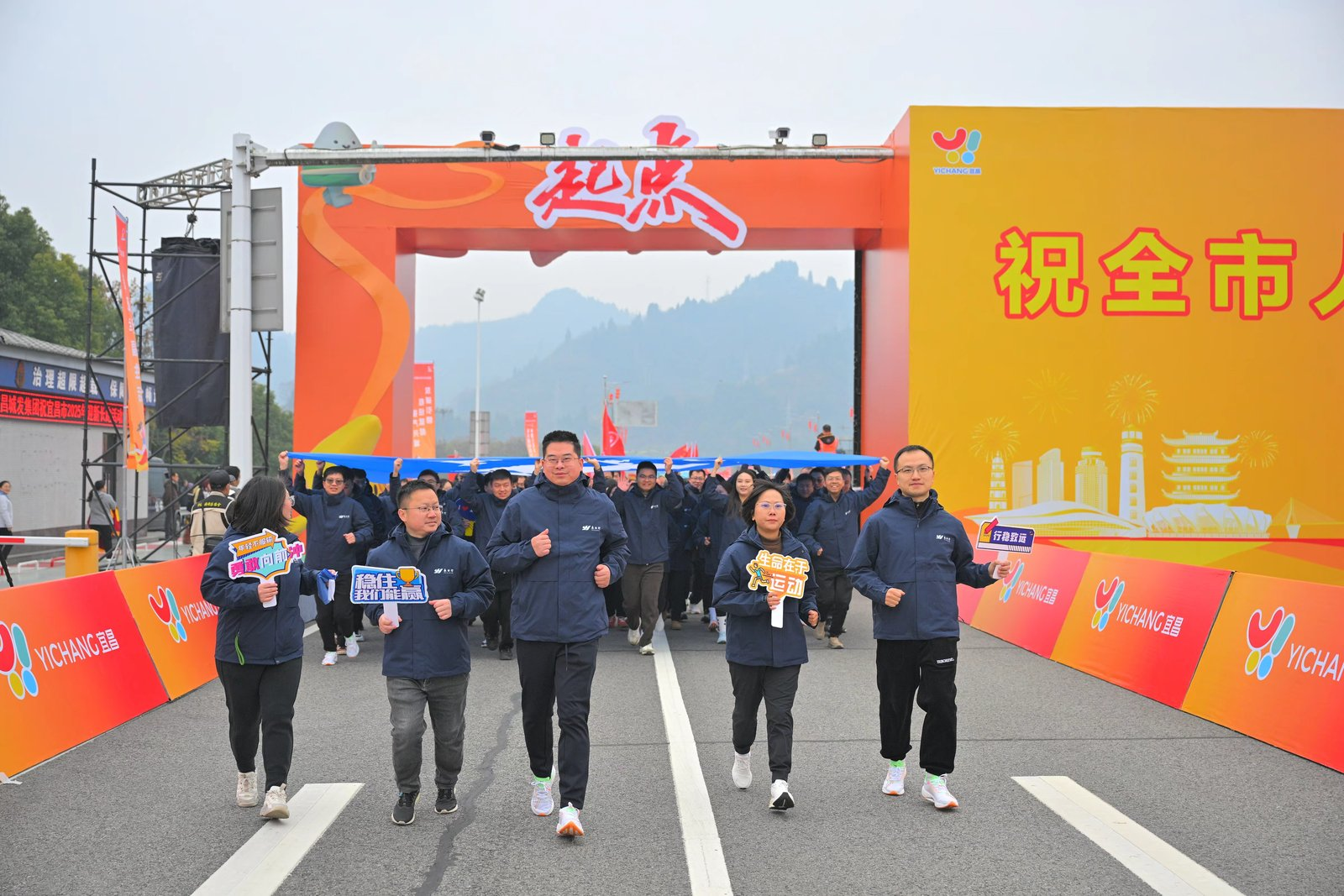 2024年12月30日9:30,宜昌市2025年迎新长跑在夷陵长江大桥举行。永业行副总裁兼鄂西区总经理雷小明,执行总经理杨懿、黄丽群,副总经理赵智伟等带领鄂西区60余名员工参加活动。